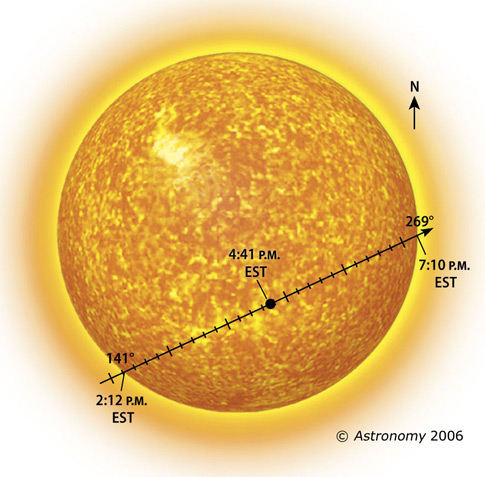 Mercury begins its star trek at 2:12 p.m. EST, when its disk first appears to touch the Sun’s limb as seen from Earth. Two minutes later, and for the next 4 hours and 54 minutes, Mercury’s entire disk appears against the bright solar surface. At 4:41 p.m. EST, Mercury makes its deepest solar incursion, passing just 7’03” away from center of the Sun’s disk. The transit ends at 7:10 p.m. EST as the planet slips off the Sun’s edge.