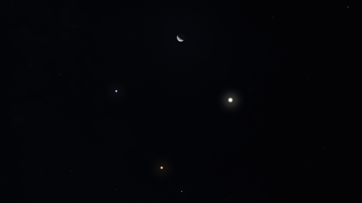 In the hours before sunrise on Tuesday, Aug. 27, you can see a nice grouping of solar system objects. First, find the roughly 40-percent-illuminated Moon. The next brightest object, to the lower right of the Moon, will be Jupiter. Then look to the lower left of Jupiter for Mars. The Red Planet, glowing at magnitude 0.8, will be several times as bright as any of the stars around it.