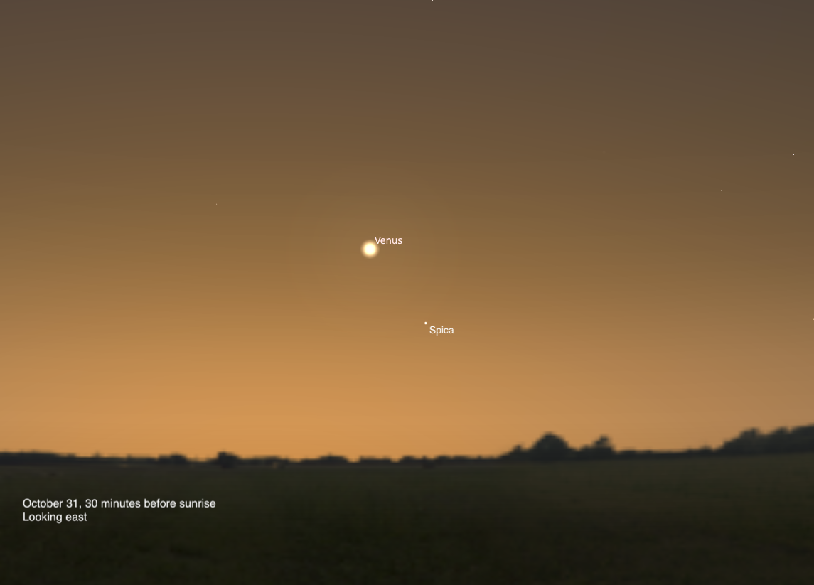 So, why are we up early? It’s also to see the blazing planet Venus rising just ahead of Spica, Virgo’s alpha star. Magnitude –3.9 Venus is the brightest light in the eastern sky as it rises around 6 A.M. local daylight time. Half an hour later, roughly an hour before sunrise, 1st-magnitude Spica has just cleared the horizon. Wait another 30 minutes — half an hour before sunrise — and the pair is about 8° high, visible if your horizon is fairly clear. Spica sits just to Venus’ lower right, and will become ever-harder to see as the sky brightens.