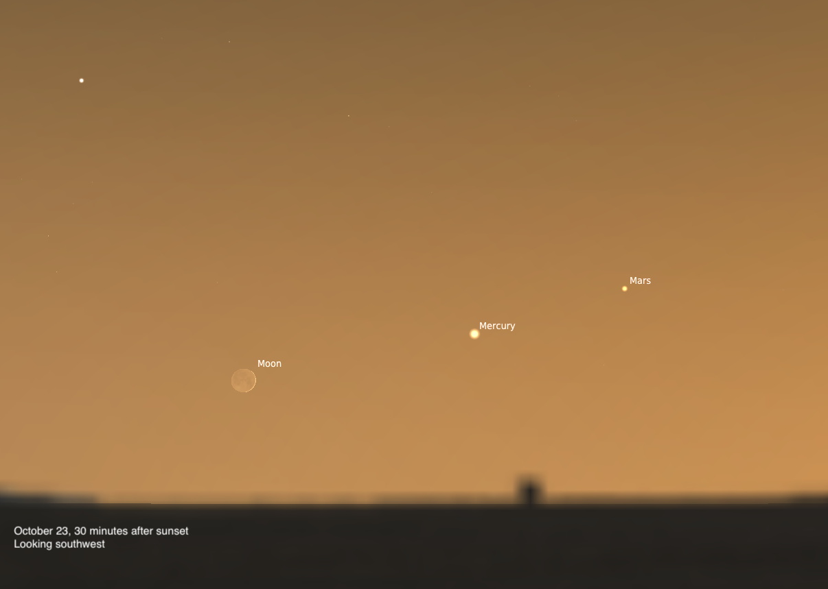 If you’re quick and have a clear southwestern horizon, you can try catching the trio just after sunset. Half an hour after sunset, they are only 3° high in the southwest. The Moon is lowest, with brighter Mercury to its upper right, and fainter Mars to Mercury’s upper right.