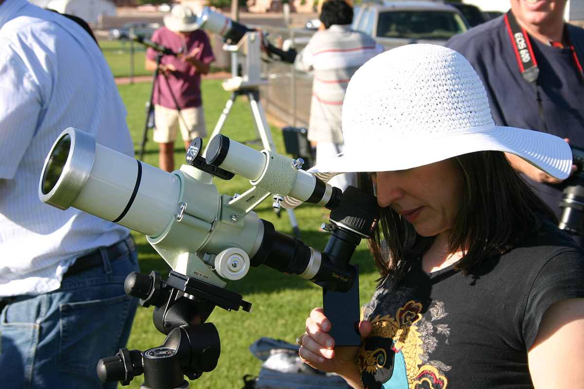 But you won’t see any sunspots unless one happens to be about twice the diameter of Earth. Such spots do appear, albeit rarely. For a better view, point a telescope with an approved solar filter — attached to its front — at the Sun. Then you can change magnifications by simply switching eyepieces, just like you do when you’re observing a nighttime celestial object. Remember, though, the filter always goes at the front of the optics you’re using — your eyes, binoculars (you’ll need two filters), or a telescope. By observing the Sun, you’ll effectively double the use of your telescope. Good luck!