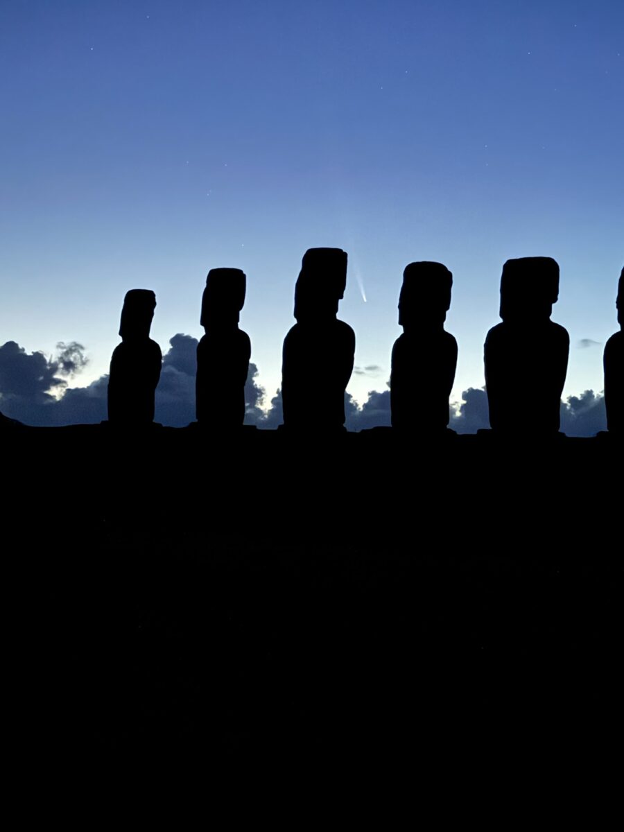 And the glories kept coming. As dawn began to brighten, we saw the current poster child of comets, C/2023 A3 Tsuchinshan-ATLAS, really bright at perhaps 2nd magnitude, rising in the east, among the row of Moai statues. It was an amazing astronomical treat that seemed like something out of a film, so dazzling was it.