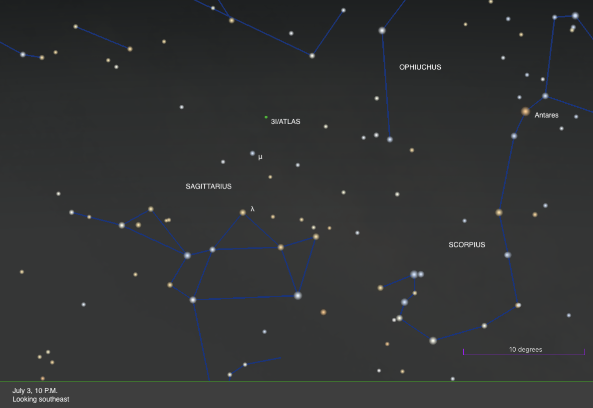 If you want to try snagging a photo for yourself, 3I rises in the east tonight around 7:30 P.M. local daylight time from mid-latitudes, before the summer Sun has set. It’s now located in northwestern Sagittarius, which tracks low through the southern sky for most of the U.S. The region reaches its highest point in the southern sky around local midnight.
