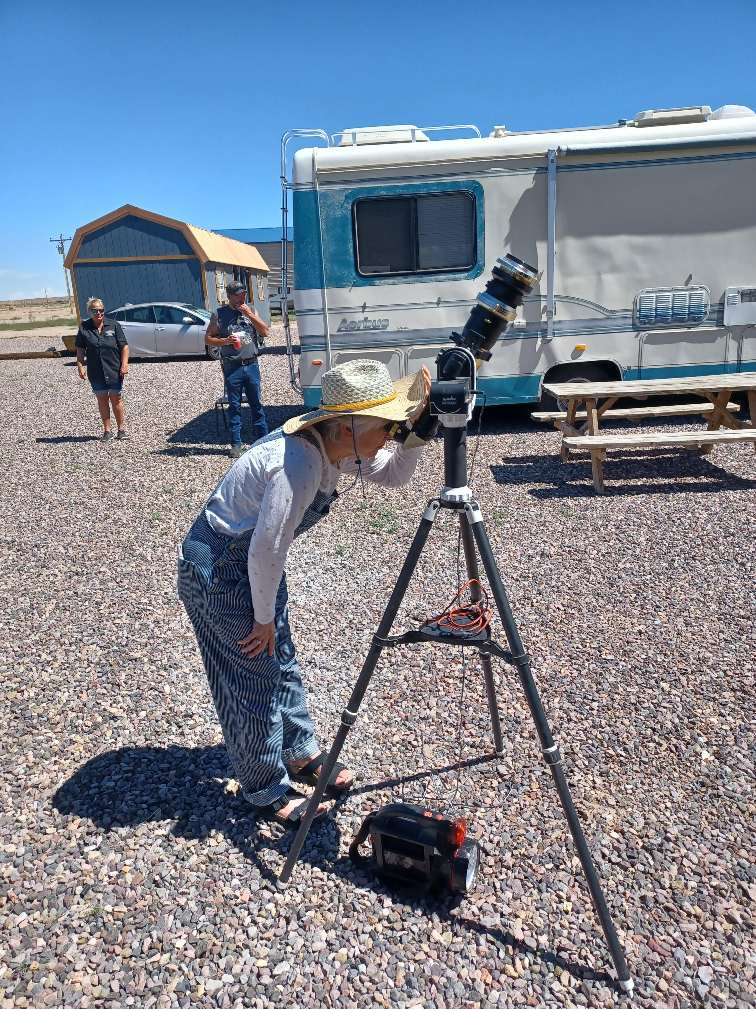 You’ve placed your solar filter on the front of your telescope and want to point it at the Sun, but you’re not certain how to get the Sun in the field of view. You also don’t have one of those tiny “Sun finders,” which can be a real help (hint!). Long ago, I learned to use the “smallest shadow” method. Insert your longest focal length eyepiece (so you have the widest field of view), then loosen the locks on your drive and move your telescope by hand until the shadow of the tube is smallest on the ground. If the Sun isn’t in the field of view at that point, usually a small movement of the tube will find it.