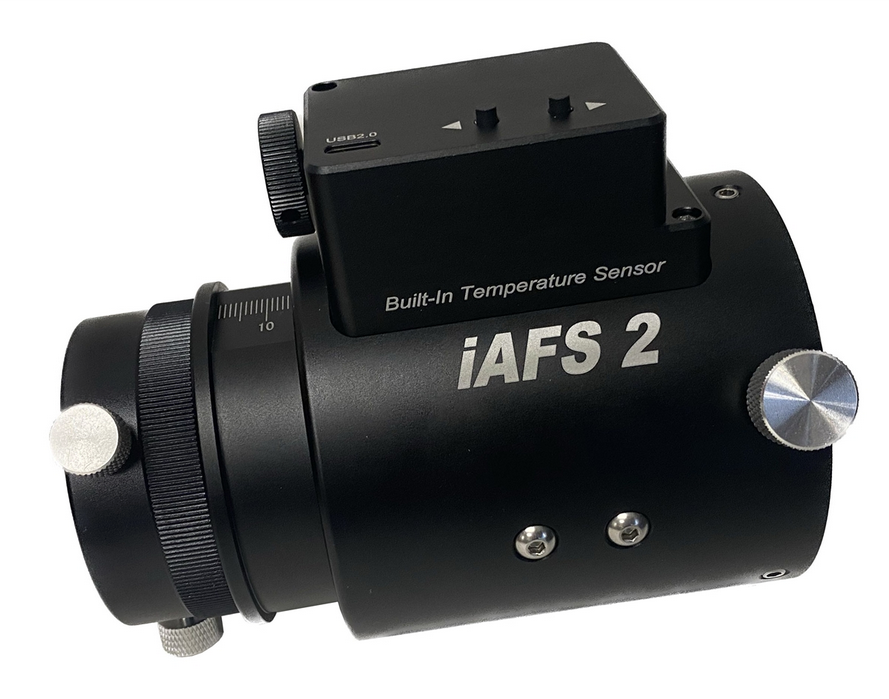 The iAFS2 automatic focuser is designed to stay focused even after it is adjusted. It allows the user to control its movement three ways: by connecting to a computer, with affixed adjuster buttons, or with a manual focus wheel. The focuser also features a built-in temperature sensor and two USB ports. An optional adapter allows it to fit on most rigs.