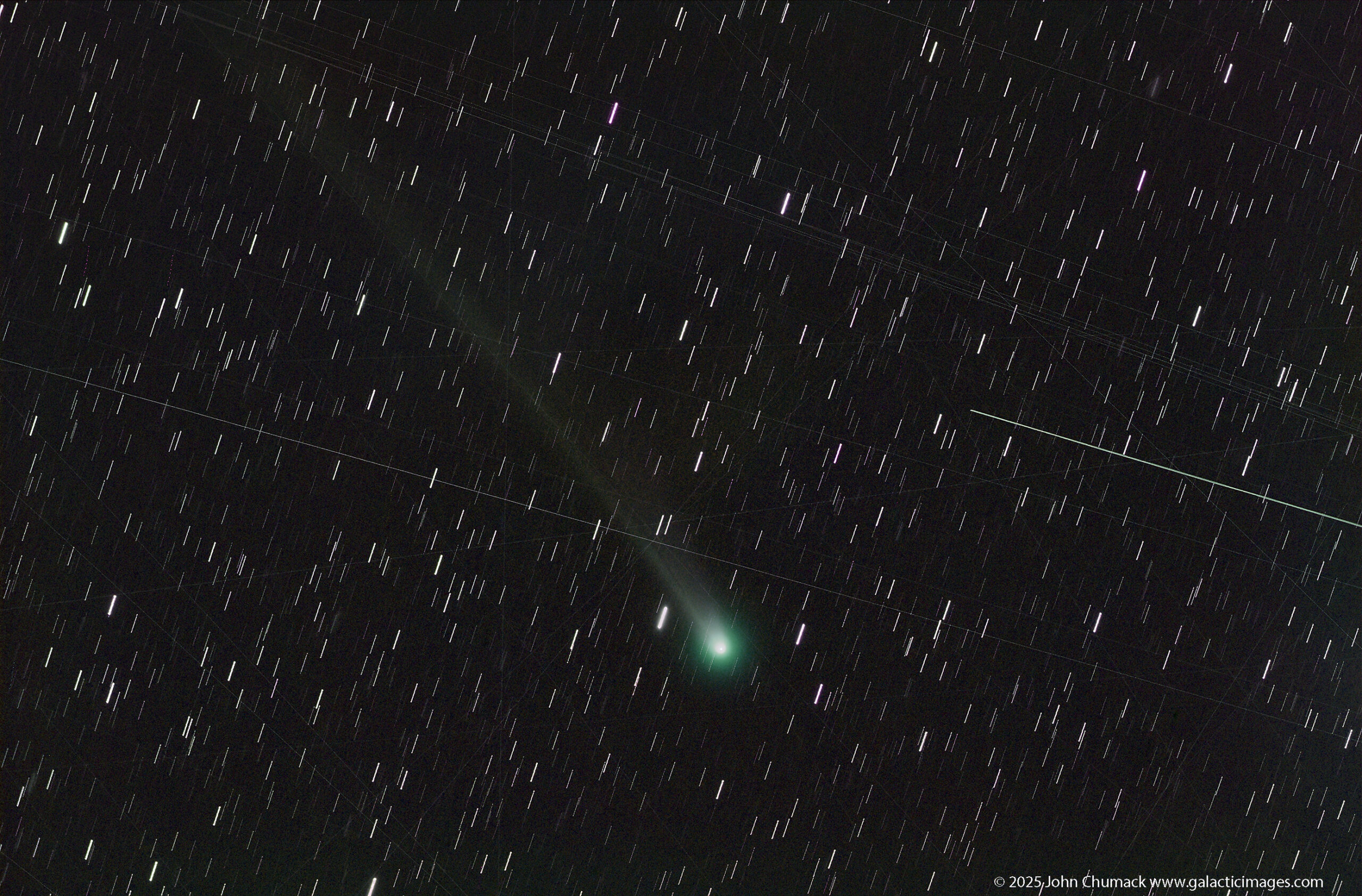 He was in his observatory taking 60-second exposures of Comet C/2025 A6 Lemmon. He captured 44 of them to stack for his final image. Of those, he noted that only six did not have satellite trails in them. That is insane.