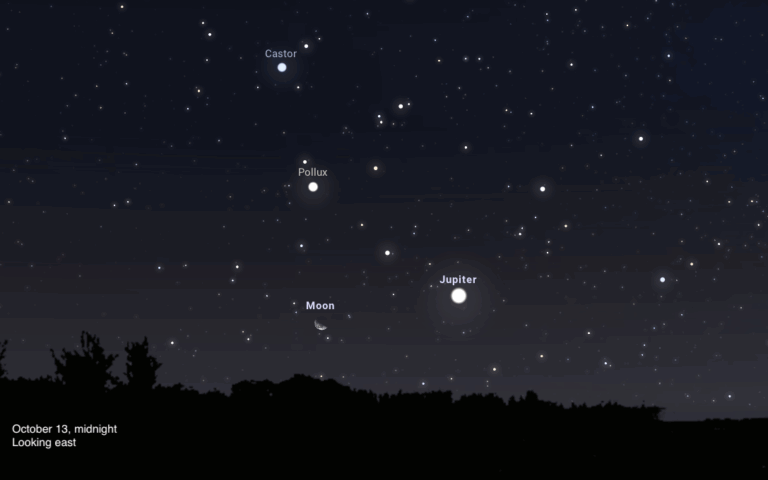 Jupiter rises around 9:30 P.M. local time in Gemini the Twins. East Coast observers will be able to see the ingress of Io’s shadow, which appears on the eastern limb around 10:20 P.M. EST. By the time Jupiter is rising in the Mountain time zone, the shadow is roughly halfway across the disk, with Io itself just crossing onto the disk from the east. Europa is farther east, while Callisto (closest) and Ganymede (farther) lie to the planet’s west.