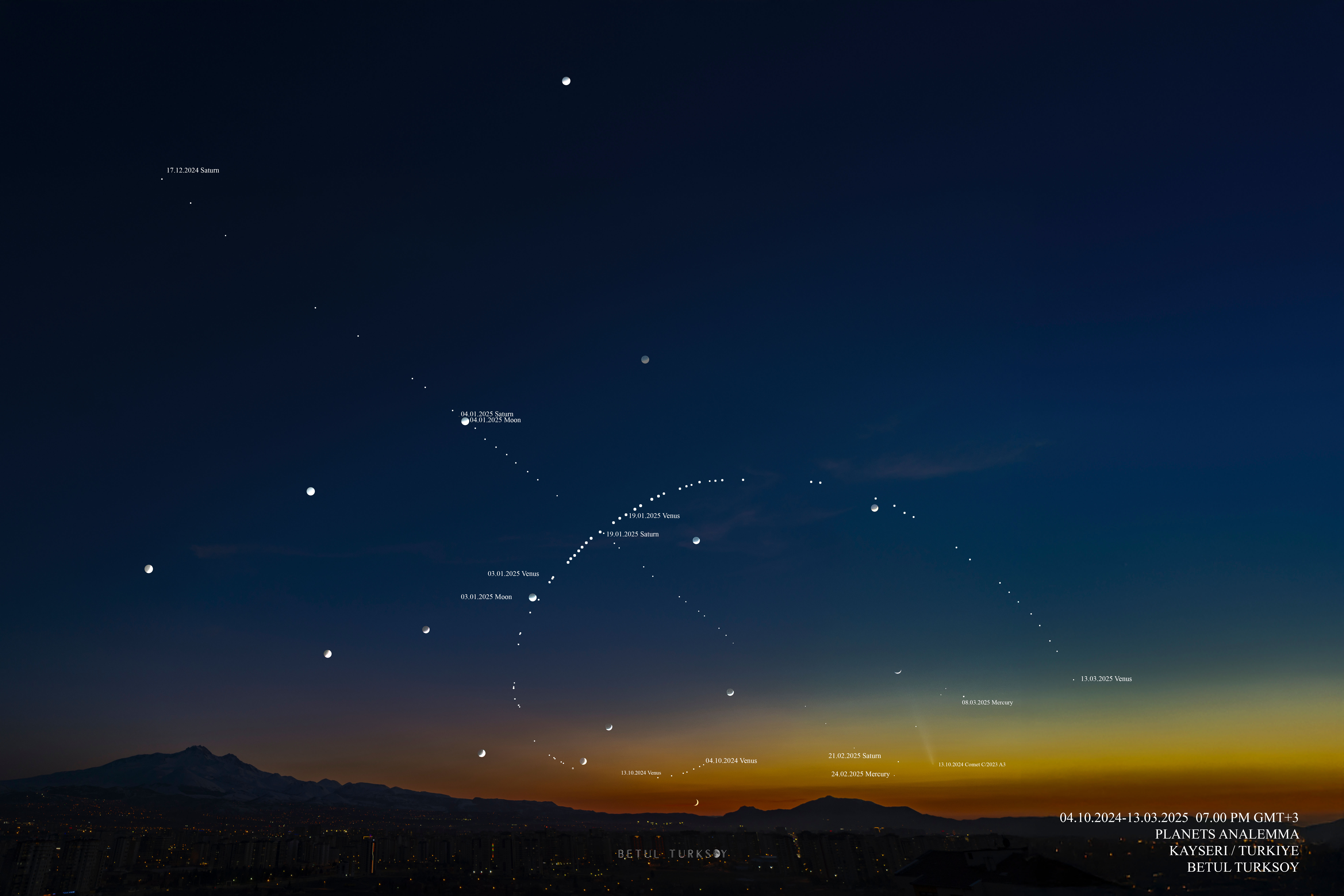 The changing sky positions of Venus, Saturn, 168飞艇彩票官网开奖历史查询_168®开采网官方结果直播 and Mercury — along with the Moon and Comet C/2023 A3 (Tsuchinshan‑ATLAS) — are captured in this composite spanning October 2024 to March 2025. The analemma-like arcs reflect orbital geometry and elongations at dusk. The photographer used a Sony a7R II mirrorless camera and Samyang 18mm f/2.8 lens. You can view an annotated version of this image (including the position of the Moon) by clicking here.