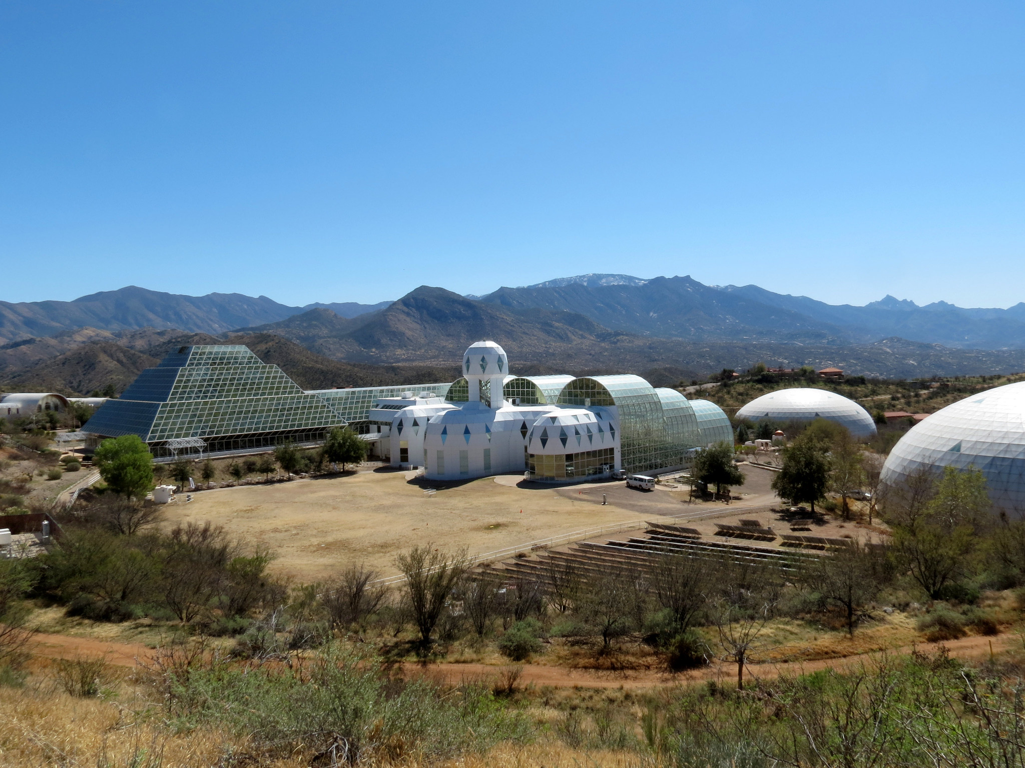 From a distance, Biosphere 2 emerges from the cacti and creosote of the Sonoran desert like a gleaming oasis, a colony of glass and bright white structures. Despite being just outside Tucson, Arizona, it looks almost like a colony on another planet.