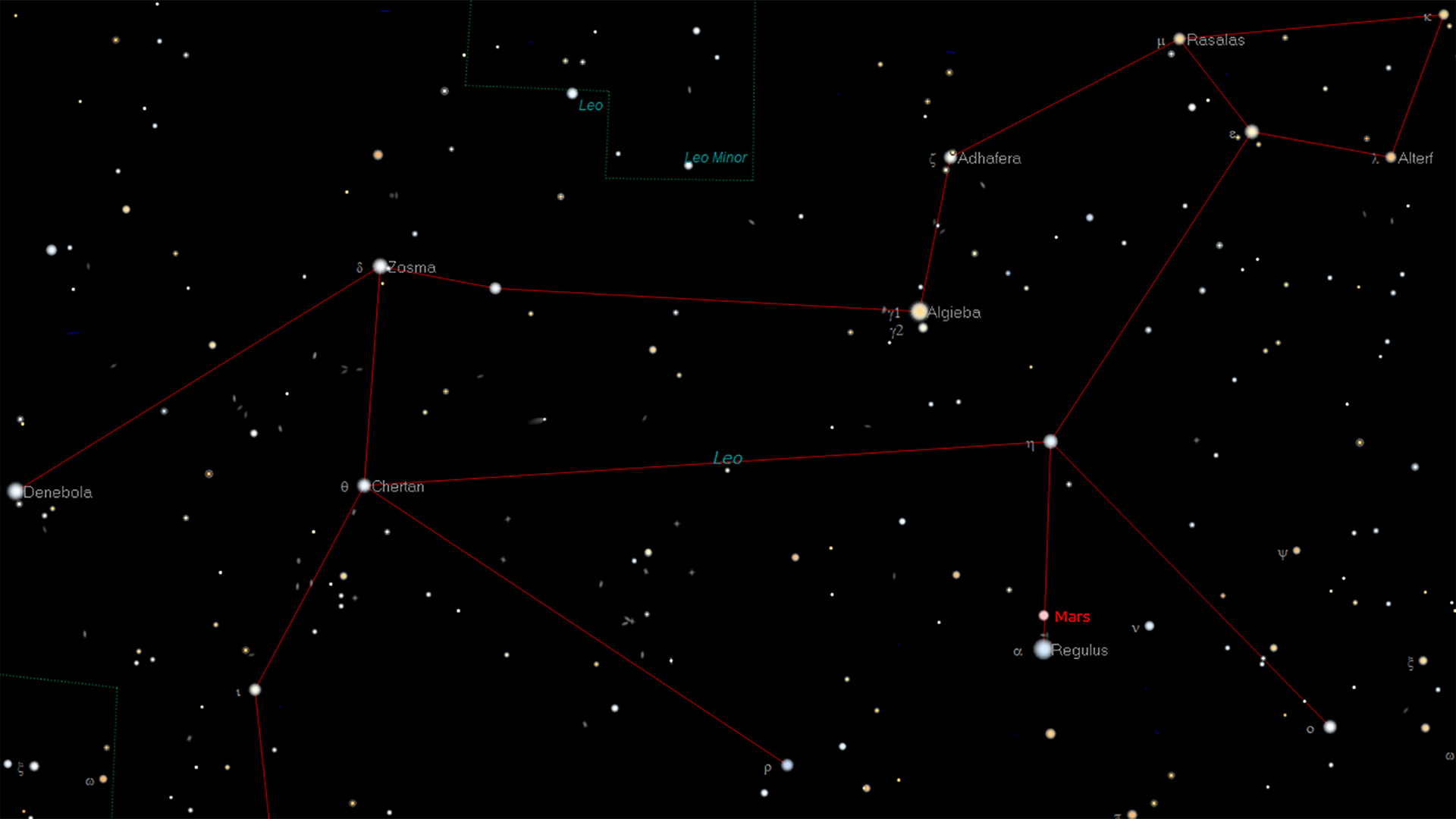 On the evening of June 16, 2025, Mars will pass quite close to the bright star Regulus in Leo the Lion.
