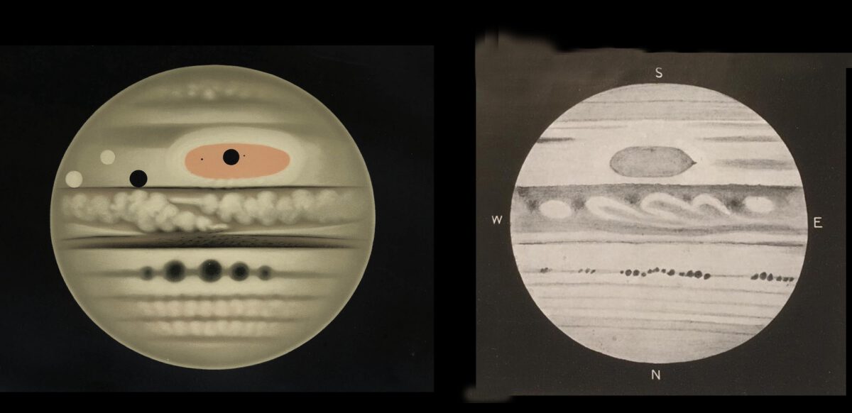 Another eyebrow-raising Jupiter drawing was created on Nov. 1, 1880, by French astronomical artist Étienne Léopold Trouvelot, recording five large black spots on the planet’s North Temperate Belt (NTB). He described the view in his 1882 book The Trouvelot Astronomical Drawing Manual, noting that in October 1880, a relatively calm four-year period on Jupiter ended “when considerable commotion occurred on the northern hemisphere.” He also stated that when the spots first appeared, they “had some resemblance to Sun-spots without a penumbra, with bright markings around them, resembling faculae. These round spots subsequently enlarged considerably, until they united along the entire line, encircling the planet, and finally forming a narrow pink belt…”