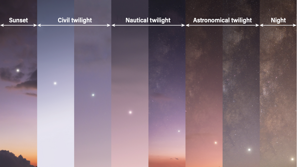 A much shorter project, only a few hours long, can be done with a bright planet like Venus or with a crescent Moon. Focus on these in the twilight period and capture the changing sky background. Start just before or at sunset when Venus or the Moon becomes visible. Then take an image during sunset, civil twilight, nautical twilight, astronomical twilight, and astronomical night. Such images of Venus in particular will slowly reveal the background stars as darkness falls, and are ideal if it’s in or near a prominent region in the sky (like Sagittarius). If your target is the crescent Moon, you’ll capture earthshine as well as the background stars.