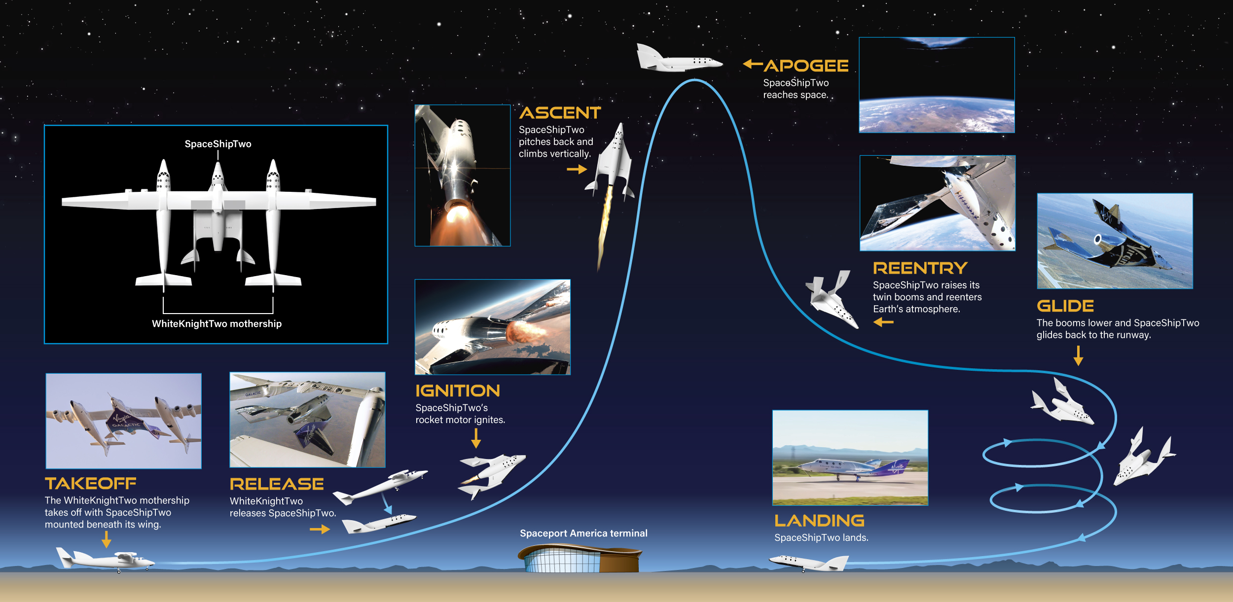 Once the spaceship goes supersonic a few seconds into its flight, its commander pulls back the control stick to pitch the vehicle from horizontal to vertical for its ascent to space. The powered boost phase then continues for about a minute, burning out at a speed over Mach 3, and with enough energy to ascend to just above 50 miles (80 kilometers) in altitude. When the engine cuts off, the spaceship becomes weightless for its coast to apogee (the point of highest altitude), and then back down until atmospheric drag forces begin to decelerate the vehicle. The entire weightless portion of the mission lasts just four minutes.
