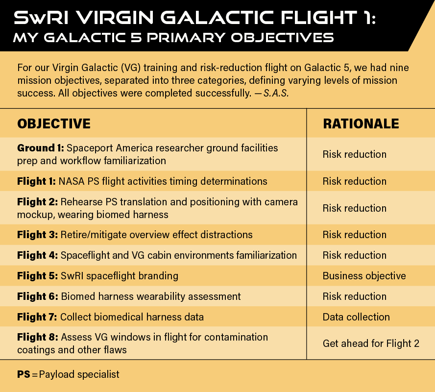 Once our proposal had won, we knew there would be a high expectation of “getting the goods” (i.e., achieving success). So, we decided to use a SwRI-funded Virgin Galactic flight specifically to familiarize me with spaceflight and to mitigate some of the obstacles to success that could have appeared on the NASA flight, had it been my rookie mission.
