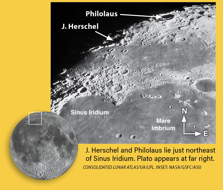 Slightly north of Sinus Iridium, there’s rugged terrain just now coming under sunrise. Look for the craters J. Herschel and Philolaus, marked on the image for this entry. The former spans some 96 miles (155 km) and is about twice as wide as the latter, and also much older as well.