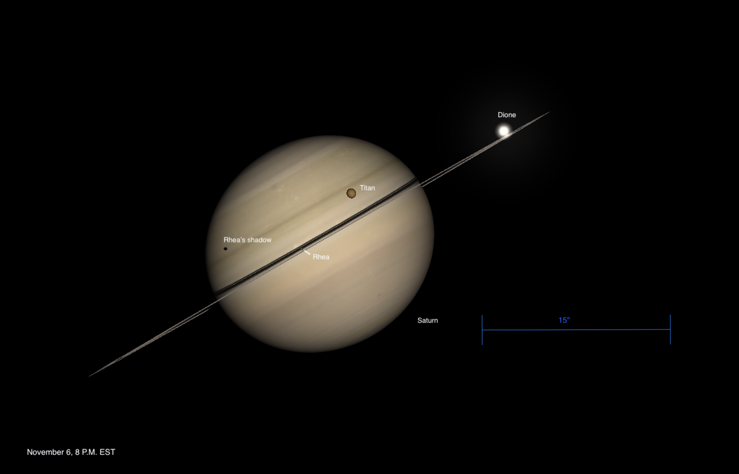 - The text also describes the transit of Saturn's largest moon, Titan, across the planet's disk on November 6, along with concurrent, albeit less visually distinct, transits of Dione and Rhea and their shadows.