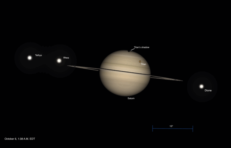 Meanwhile, Titan transits Saturn tonight, with the event underway as darkness falls on the East Coast. By the time the sky is dark, you’ll see Saturn 30° high in the southeast, glowing at magnitude 0.8 (the brightest light in that region). You’ll need a telescope to watch the transit.
